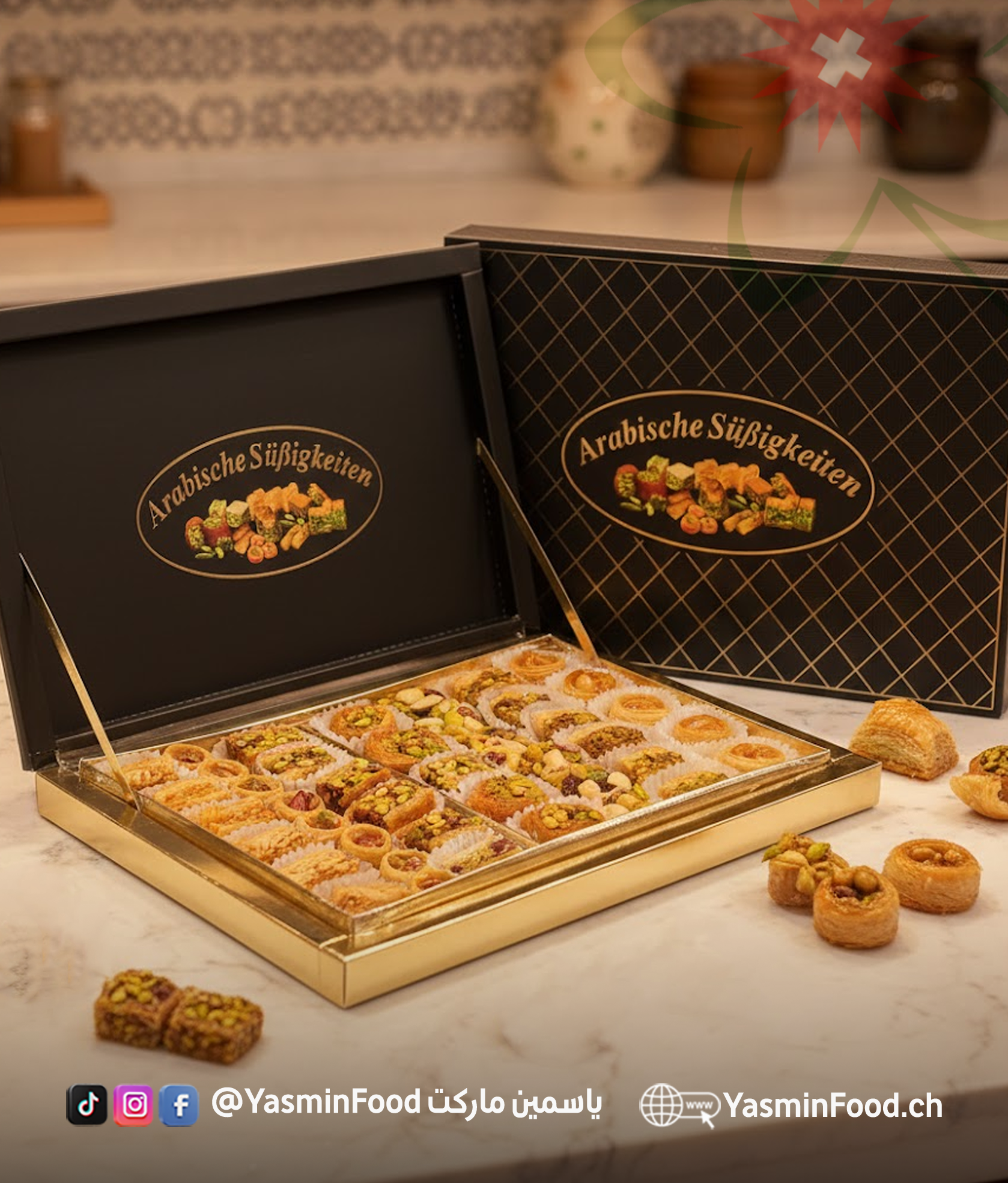 • تشكيلة فاخرة من البقلاوة العربية المحشوة بالمكسرات المختارة بعناية،